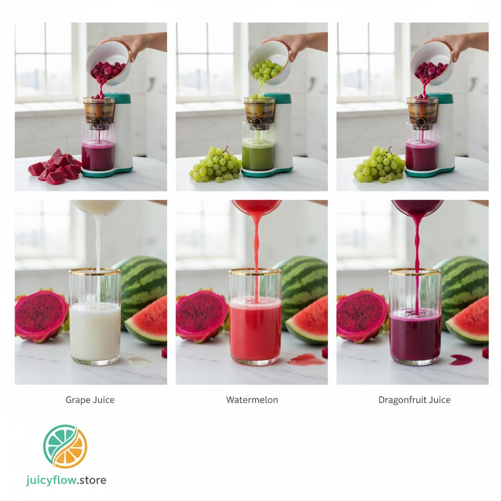 Enjoy the beauty of natural colors and flavors with JuicyFlow. From vibrant dragon fruit to sweet watermelon and crisp grapes, our juicers capture the essence of every fruit. Each glass is packed with nutrients, freshness, and joy — made effortlessly with JuicyFlow’s smooth extraction technology. Healthy living has never looked this good.
